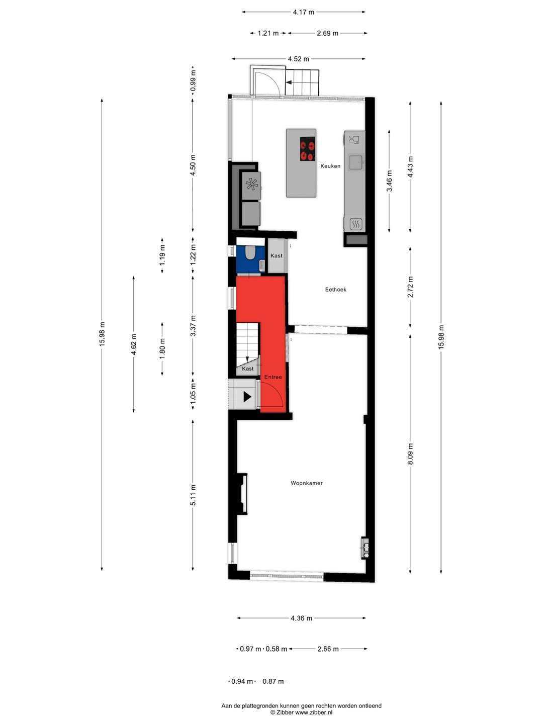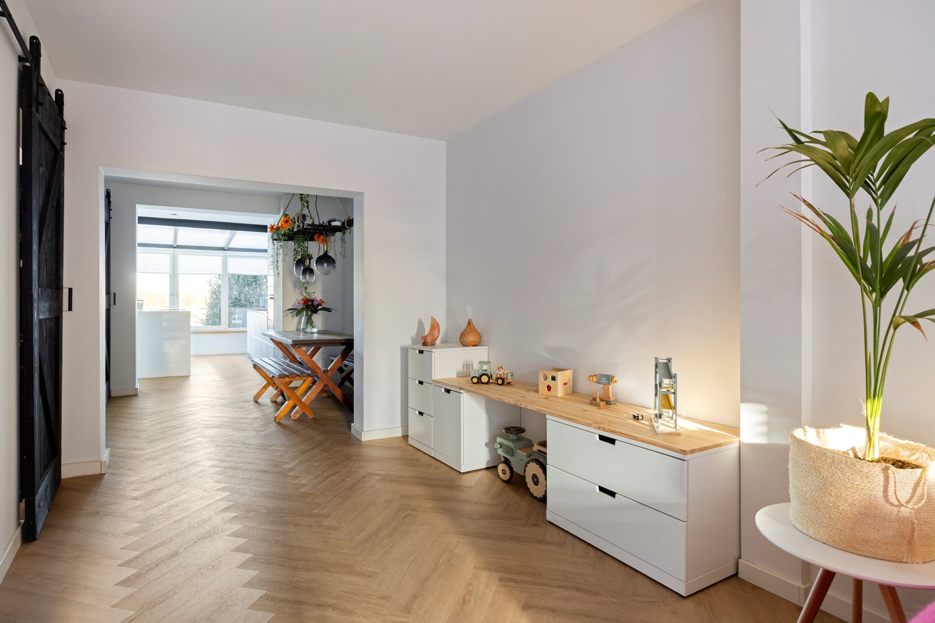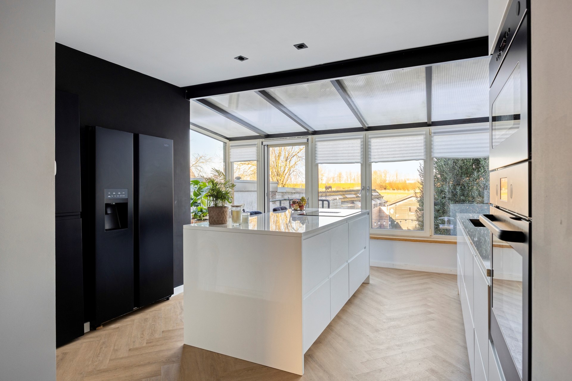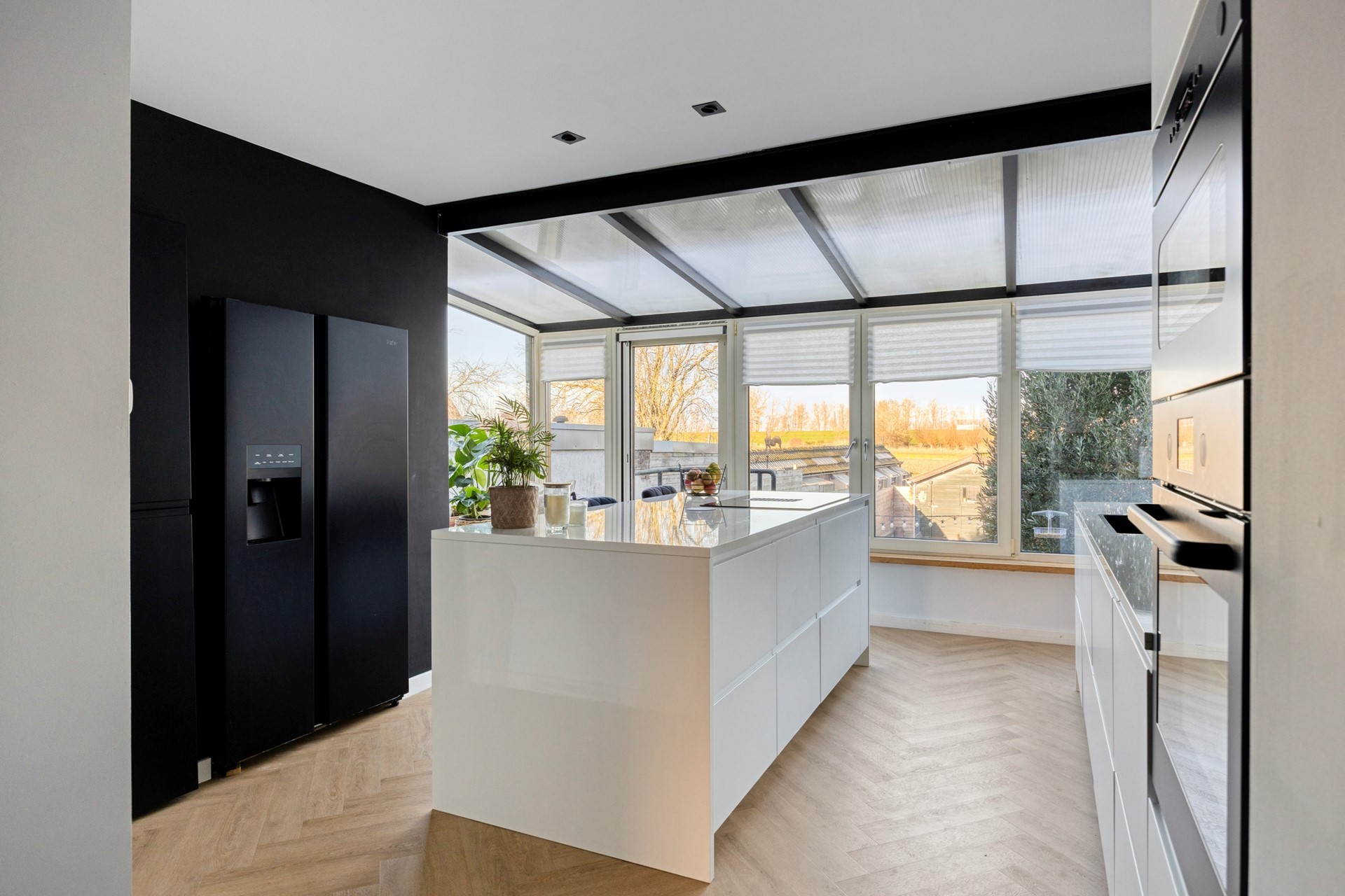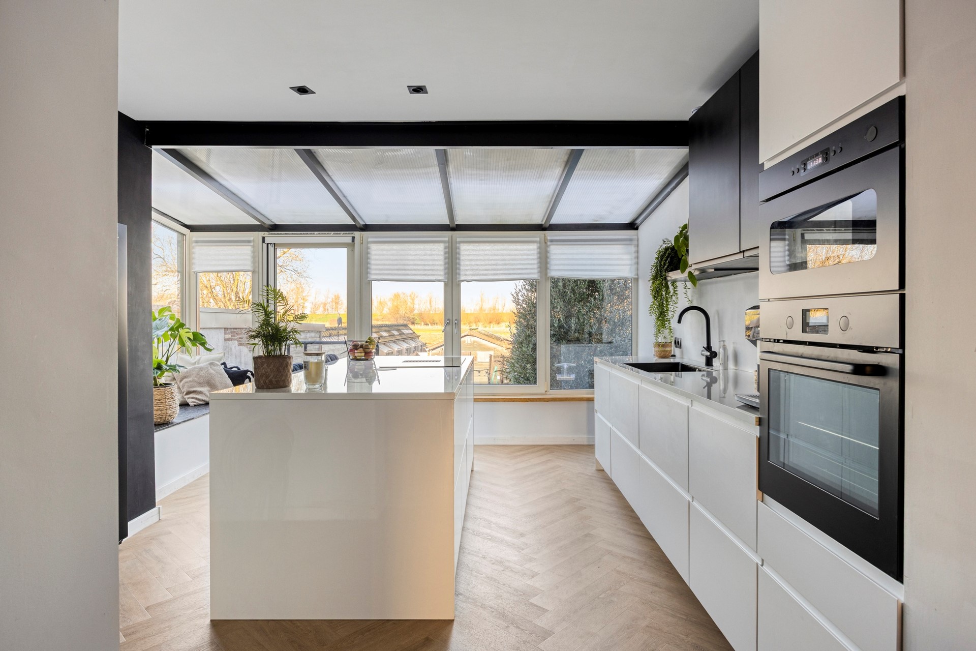 BEGANE GROND De woonverdieping bevindt zich op straatniveau. Bij binnenkomst tref je in de hal een voorraadkast en trapkast aan, een toiletruimte, de trapopgang en toegangsdeur naar het woongedeelte. Hier ligt de ruime en lichte woon- en eetkamer, die in open verbinding staat met de keuken in de serre. Dankzij de grote raampartijen is er veel lichtinval en een prettig zicht op de tuin en de achterliggende landbouwgronden. De woon-, eetkamer en de keuken zijn afgewerkt met een PVC vloer en voorzien van vloerverwarming. In de woonkamer is daarnaast een airco aanwezig. De moderne open keuken is geplaatst in de serre en vormt een mooi verlengstuk van de leefruimte. De keuken is uitgerust met een kookeiland met een 4 pits inductiekookplaat en geïntegreerde afzuiging, een RVS spoelbak met heetwaterkraan, vaatwasser, oven, magnetron, een Amerikaanse koelkast en meerdere keukenkastjes. Achter een voorraadkast is de cv-combiketel opgesteld. Vanuit de keuken is er directe toegang tot de diepe achtertuin.