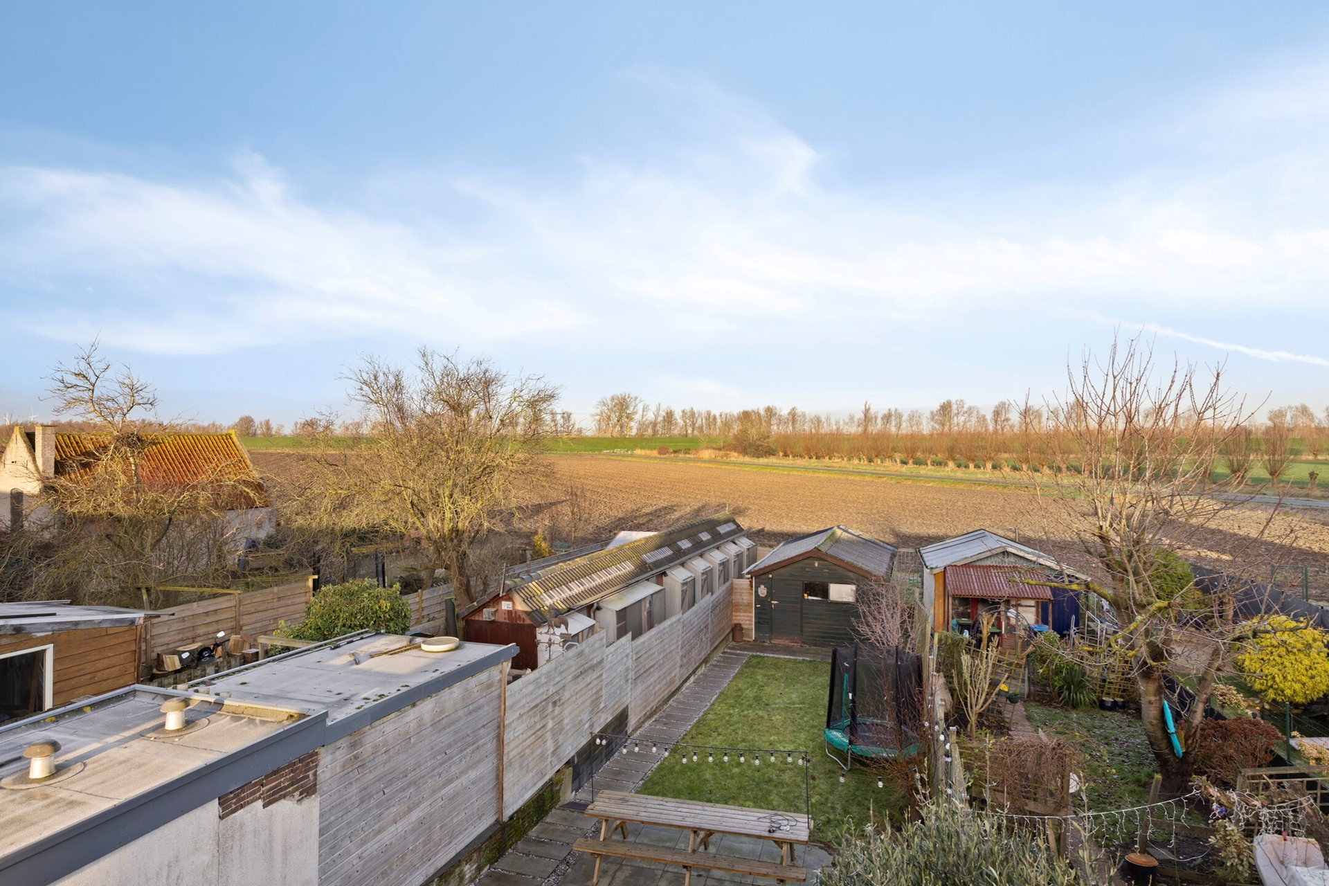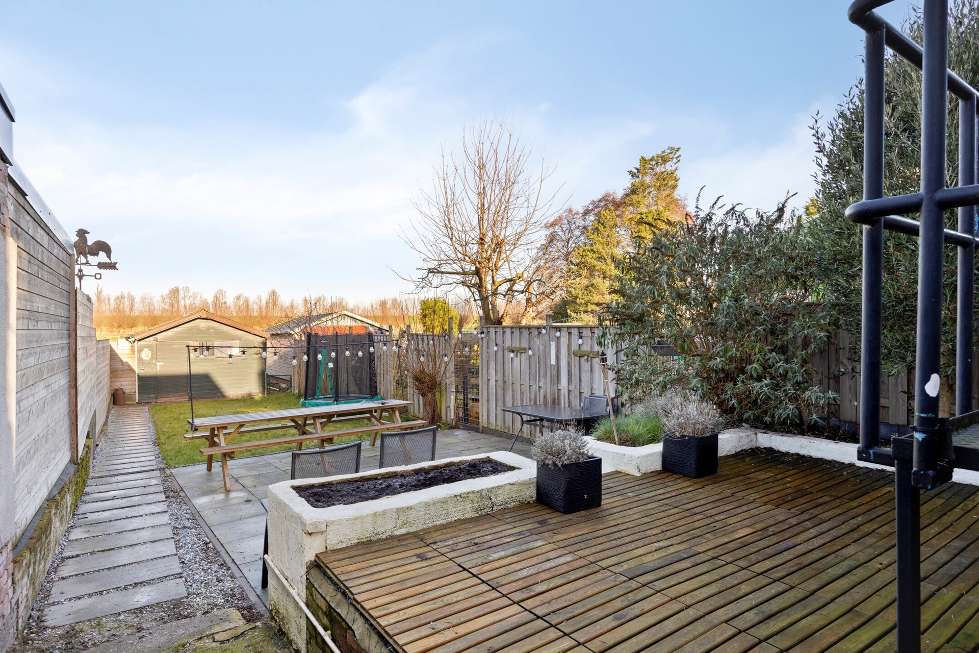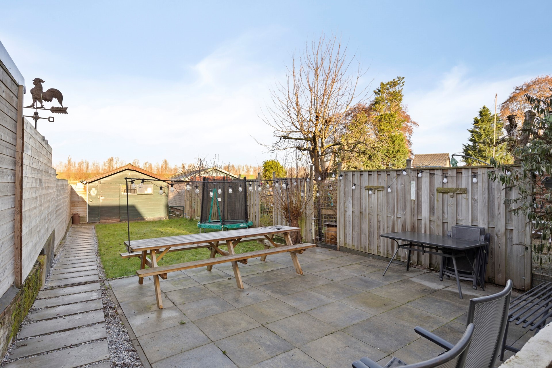 De achtertuin is circa 30 meter diep en gelegen op het noord-noordwesten. Hier is altijd een zonnige plek te vinden. Direct achter de woning ligt een sfeervol tuingedeelte, met daarachter een grote berging van circa 25 m². De tuin grenst aan landbouwgrond, wat zorgt voor een vrij en groen uitzicht. De buren van huisnummer 22 hebben het recht van overpad via de tuin naar de straatzijde.
