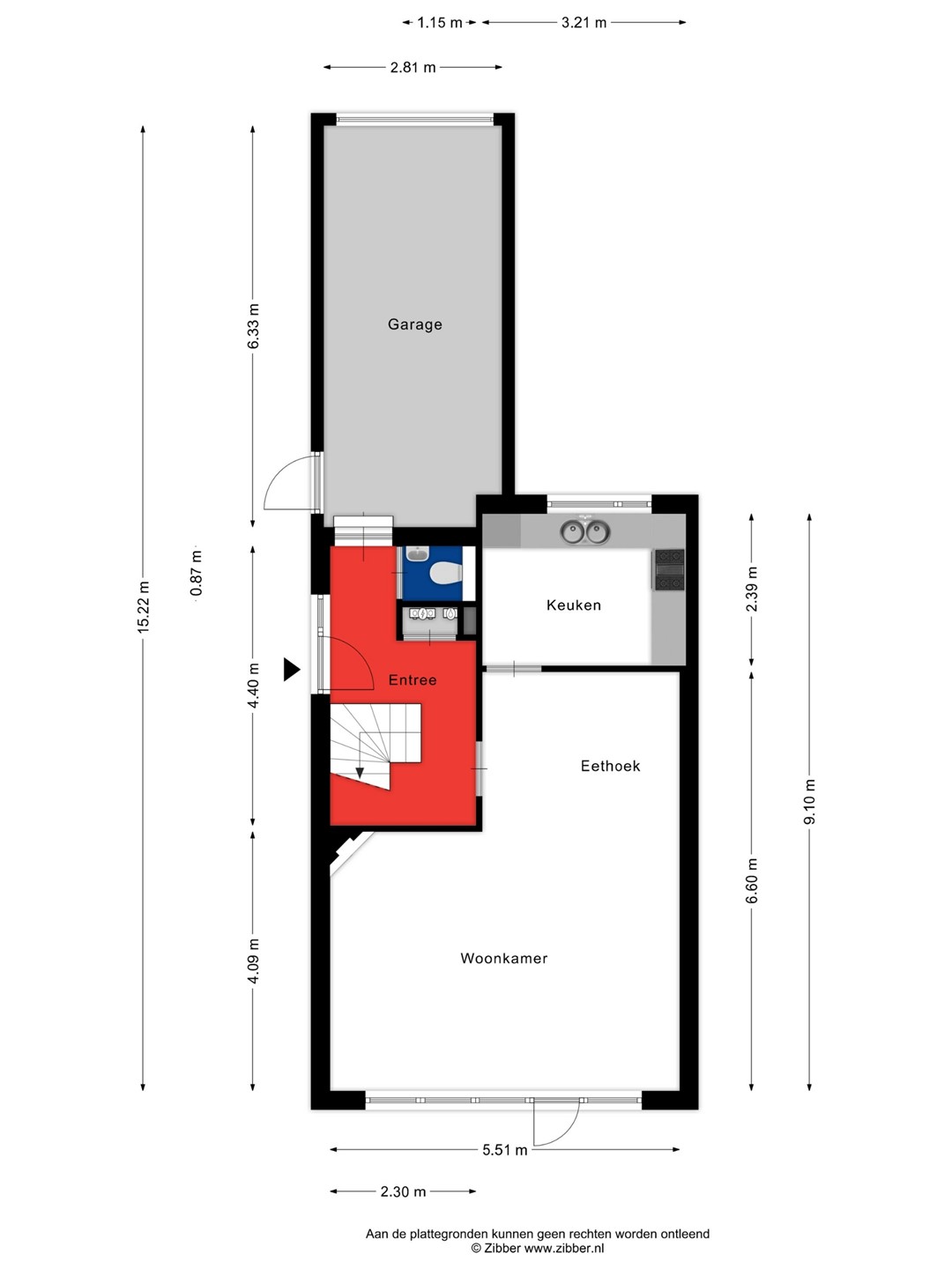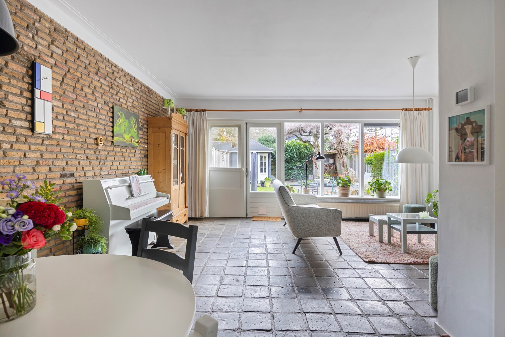 Via de voordeur kom je binnen in een ruime hal met de trap naar boven, het toilet, de meterkast en de doorgang naar de garage en de woonkamer. WOONKAMER: De woonkamer ligt in een L-vorm en heeft een tuingericht zitgedeelte met hoekhaard. De ruimte is licht en open, met een tegelvloer en deels met steen strips afgewerkte wanden. Aan de achterzijde openen dubbele tuindeuren naar de zonnige tuin, waar een houten berging, meerdere terrassen en twee mooie bomen voor een prettige sfeer zorgen. KEUKEN: De dichte keuken sluit aan op de woonkamer. De hoekopstelling is praktisch en heeft een raam aan de voorzijde, waardoor je uitkijkt op de straat. * Hal, woonkamer en keuken zijn voorzien van vloerverwarming GARAGE: De inpandige garage (6,30 x 2,80 m.) waar de wasmachine en de droger staan wordt op dit moment vooral gebruikt voor fietsen en als praktische bergruimte. Dankzij de royale afmetingen en de vliering is het een ideale plek voor opslag, een kleine werkplaats of een toekomstig kantoor aan huis. Hierdoor biedt deze ruimte extra mogelijkheden om de woning naar eigen wensen te benutten.