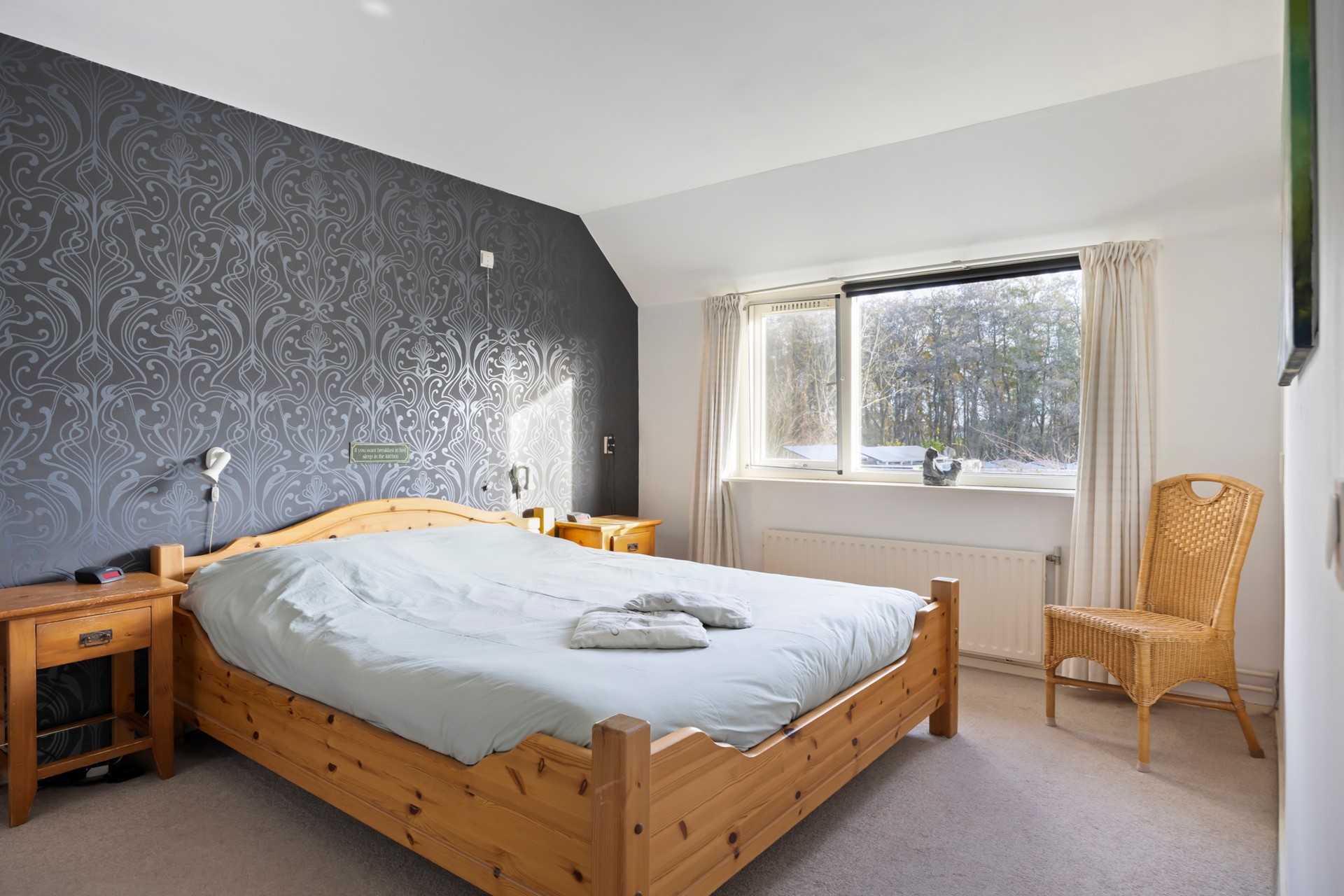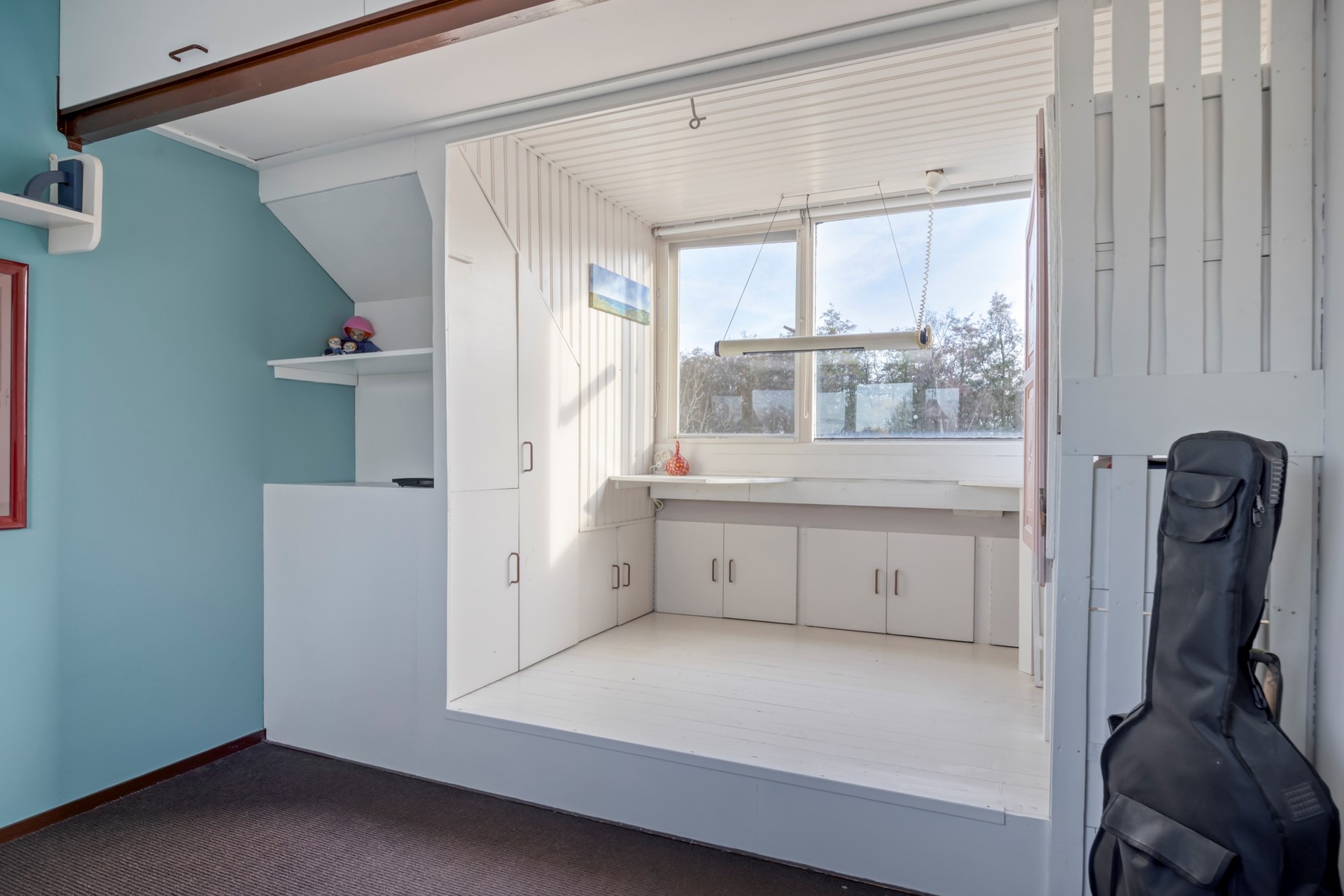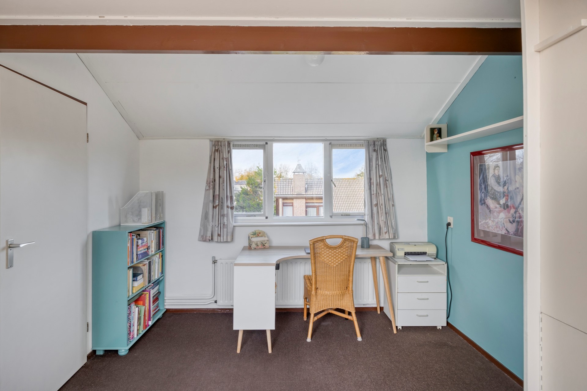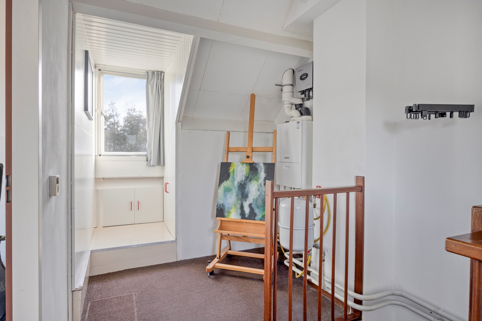 De vaste trap leidt naar de voorzolder, waar de ATAG-cv ketel hangt (2022). Dankzij twee ramen komt er veel licht binnen en de ruimte is goed bruikbaar als werkhoek. De wasmachine en droger staan nu in de garage, maar er zijn ook aansluitingen op de voorzolder aanwezig. ZOLDER(SLAAP)KAMER: Daarachter ligt de zolderslaapkamer. Deze kamer voelt ruim en licht door de grote dakkapel aan de achterzijde en drie ramen aan de voorkant. Door de verhoging bij de dakkapel is er plaats voor een bureau met zicht op de tuin en plaats voor een kast.