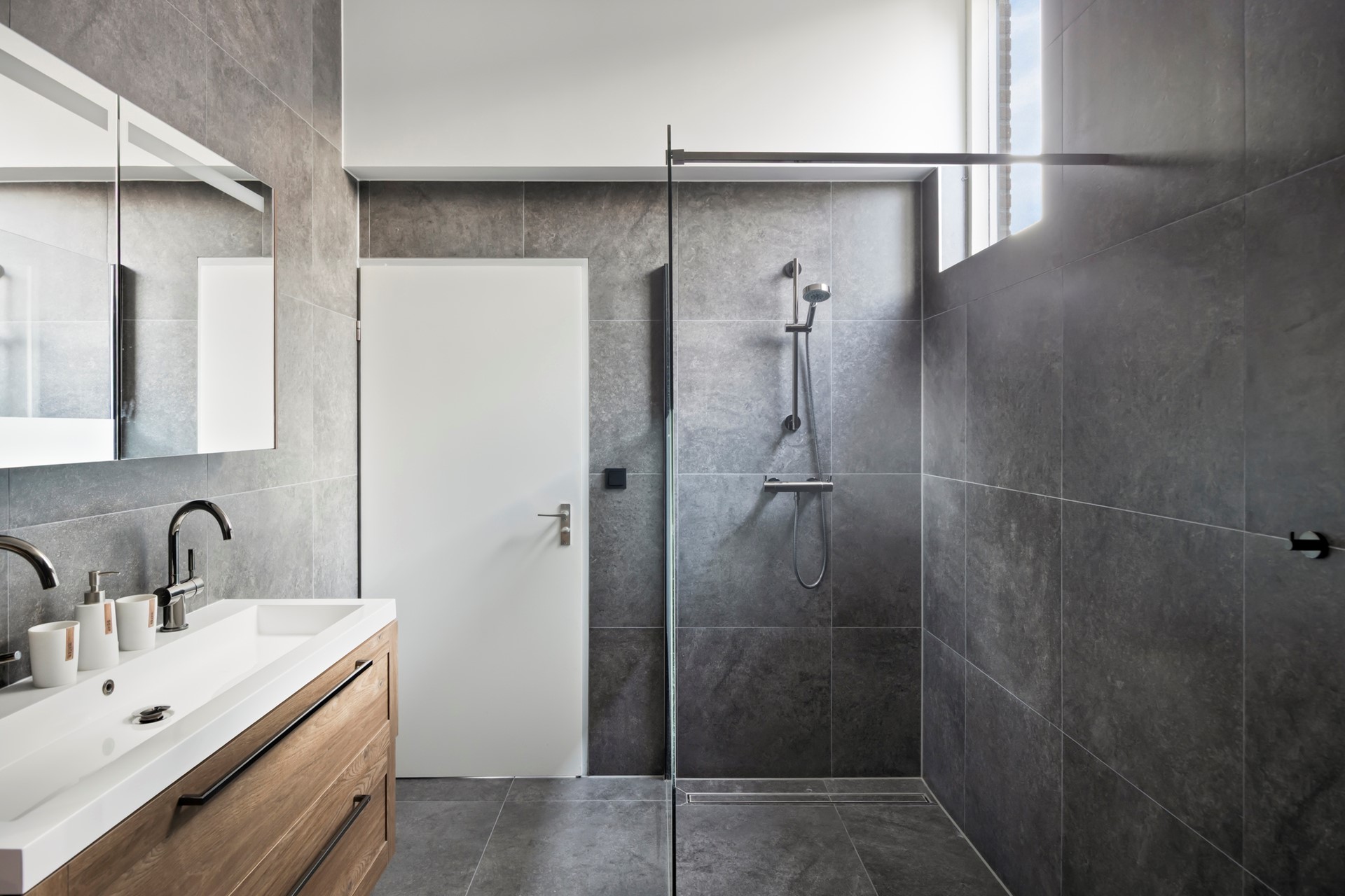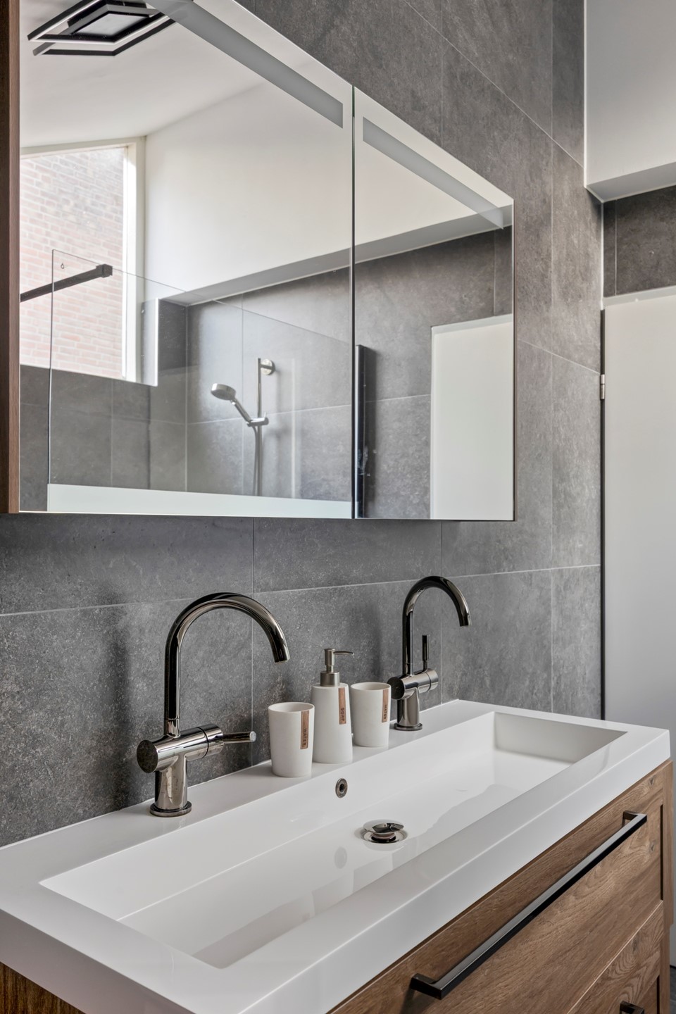 Op de overloop bevinden zich drie slaapkamers en de badkamer. DRIE SLAAPKAMERS: Twee slaapkamers liggen aan de achterzijde en bieden uitzicht op het groen van de tuin. De derde slaapkamer ligt aan de straatzijde. Op de overloop en in een kamer ligt vloerbedekking. BADKAMER: De badkamer is in 2024 volledig vernieuwd en modern uitgevoerd. De ruimte is royaal en voorzien van een dubbel wastafelmeubel met verlichting, een hangtoilet, een handdoekenradiator en een grote inloopdouche. De afwerking is fris en luxe.