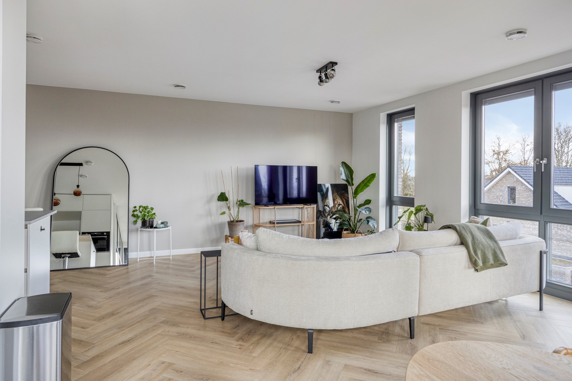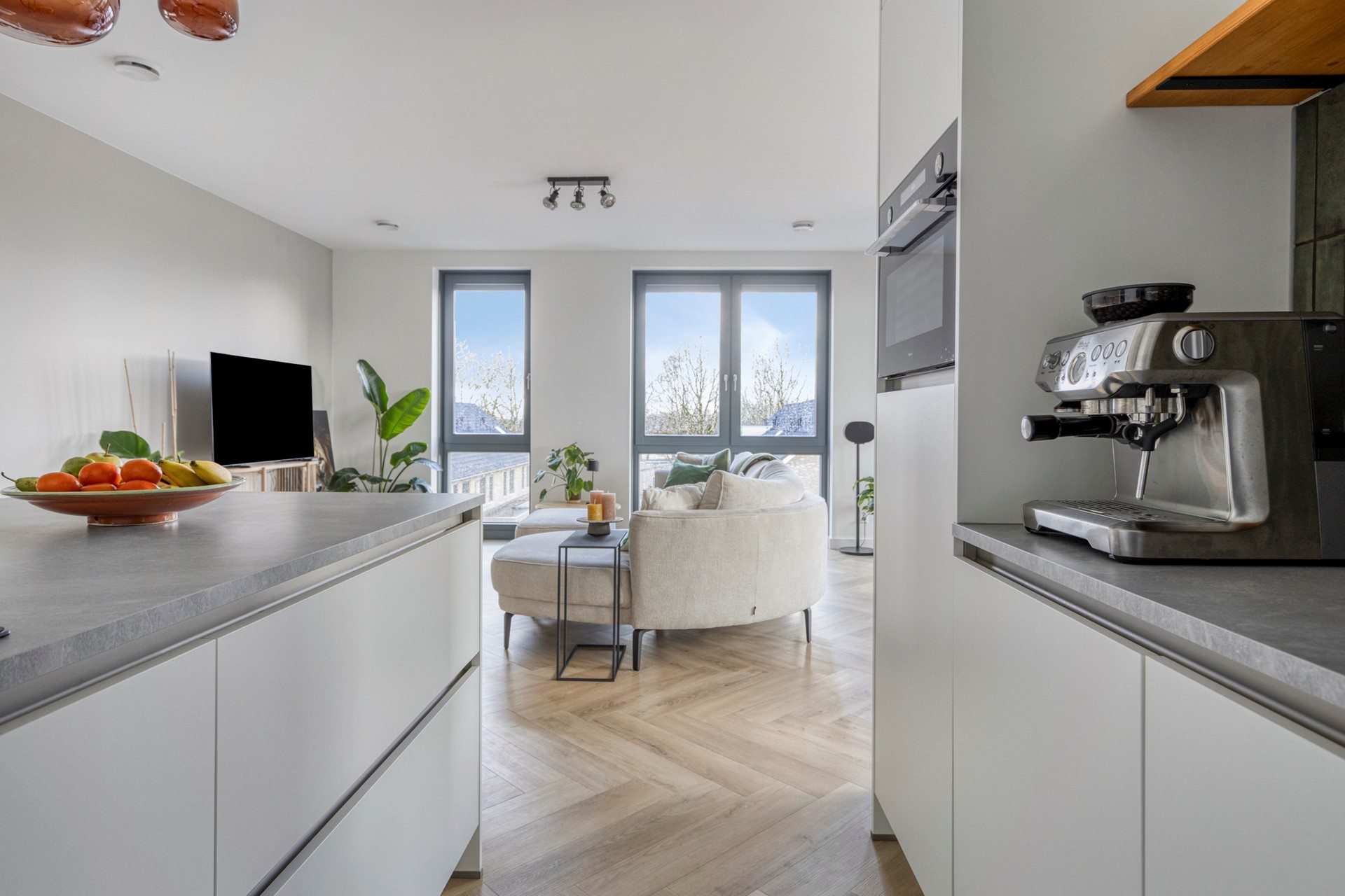 Bij binnenkomst valt direct de open leefruimte op waarin keuken en woonkamer naadloos in elkaar overlopen. De ruimte is licht dankzij de grote raampartijen rondom en biedt voldoende plaats voor zowel een zithoek als een eettafel. De afwerking is rustig en verzorgd, met zwarte stalen accenten die het interieur een moderne uitstraling geven. Door het hele appartement ligt een visgraat PVC-vloer die zorgt voor een stijlvol en samenhangend geheel. De keuken bevindt zich direct bij binnenkomst en vormt een vanzelfsprekend onderdeel van de leefruimte. Centraal staat het kookeiland met bar, waardoor koken en wonen prettig samenkomen. In het eiland is een inductiekookplaat met geïntegreerde afzuiging verwerkt, wat bijdraagt aan het strakke lijnenspel. De keuken beschikt over veel kastruimte, diverse inbouwapparatuur en is uitgevoerd in materialen en kleuren die mooi op elkaar zijn afgestemd.