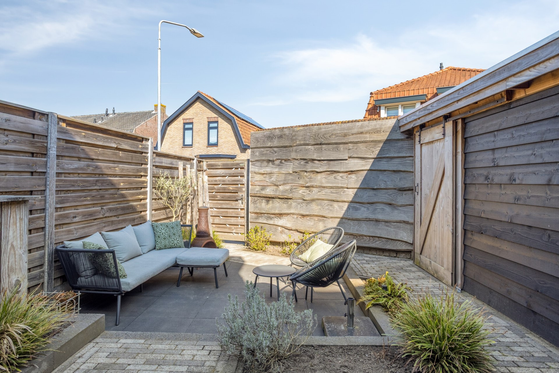 ACHTERTUIN De gezellige achtertuin is verzorgd aangelegd en gelegen op het noordoosten (circa 7 x 6 m). De tuin is voorzien van sierbestrating, een terras, borders en de opstelplaats van de warmtepomp met houten ombouw. BERGING Daarnaast is er een vrijstaande geïsoleerde houten berging met plat dak en schuifdeur en een achterom via de Lageweg.