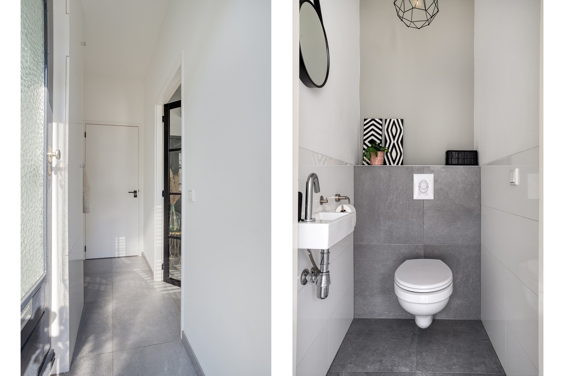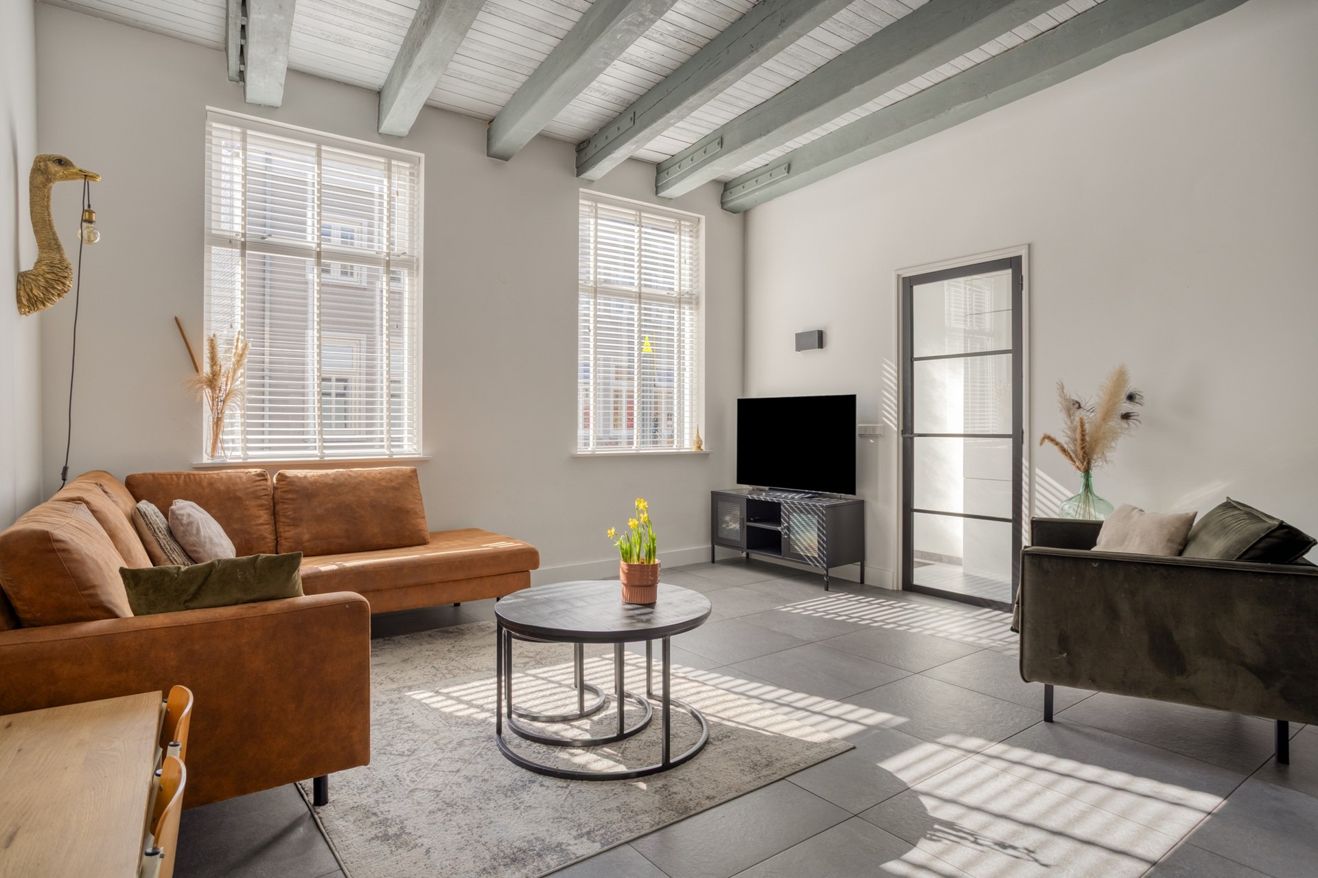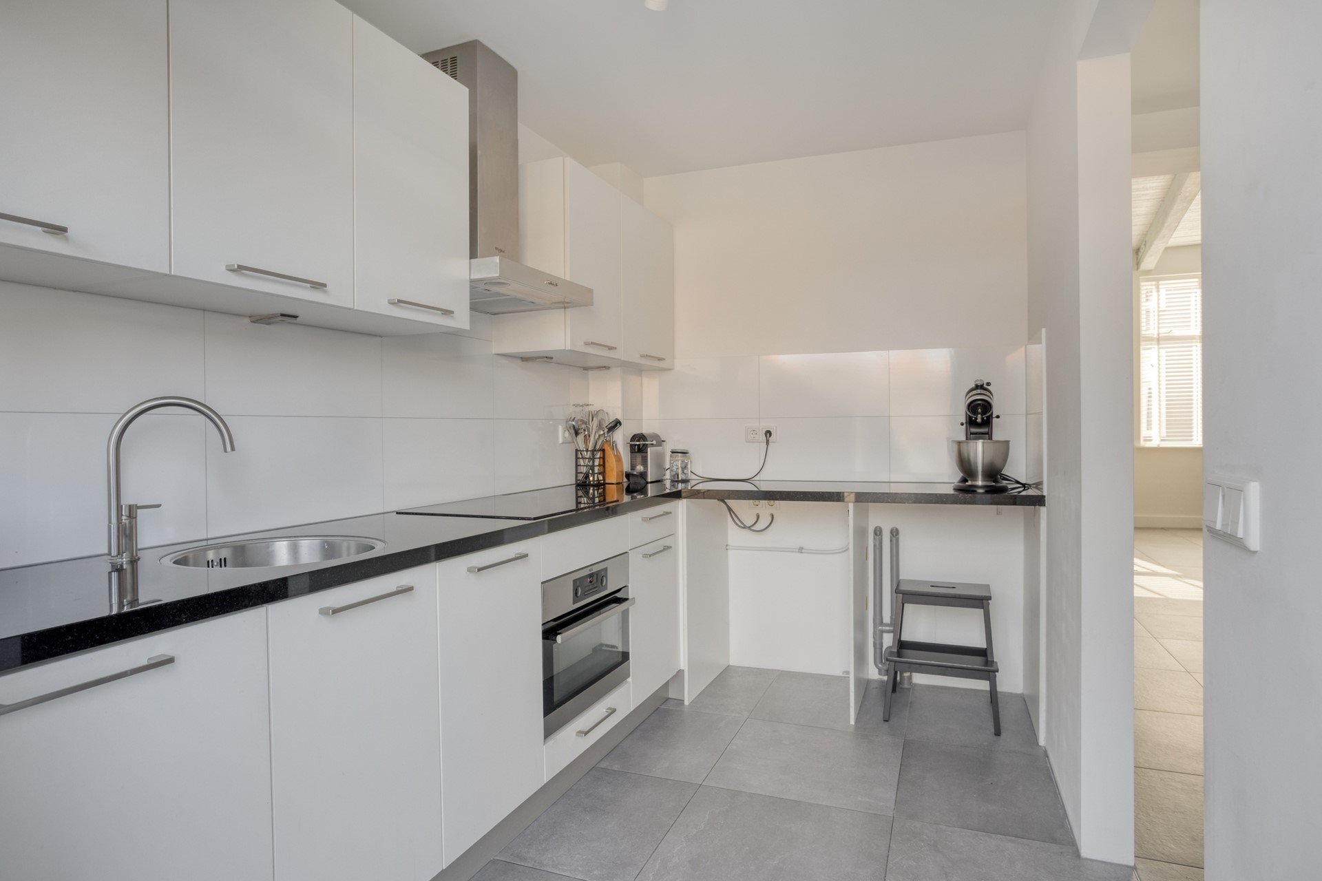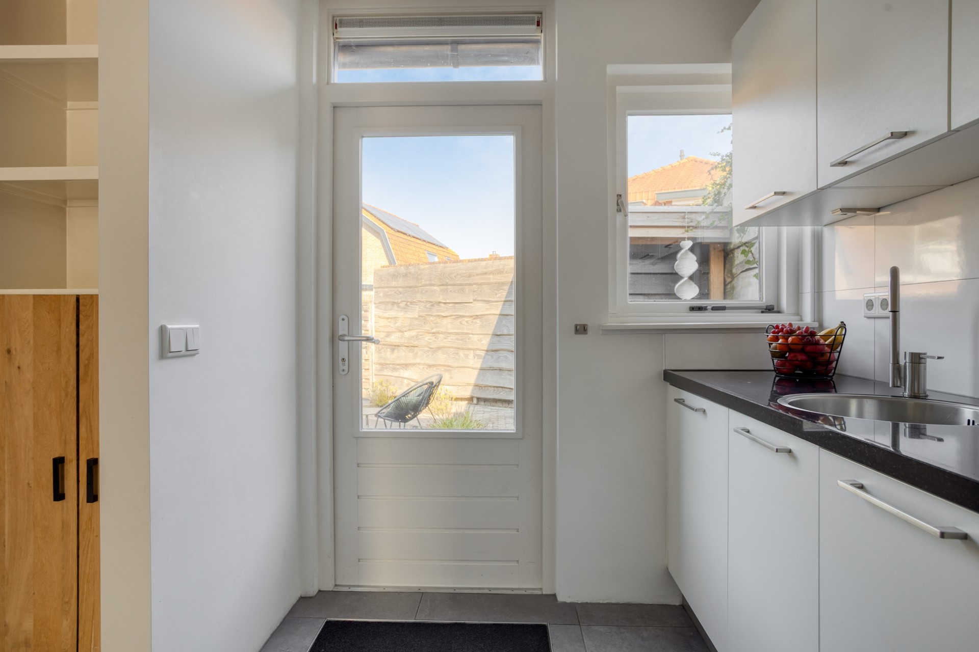 ENTREE-HAL Overdekte entree bij de voordeur. Hal met meterkast, toiletruimte en via een zwarte houten deur met glas toegang tot de woonkamer. TOILET Gedeeltelijk betegelde toiletruimte met wandcloset en fonteintje. WOONKAMER De woonkamer heeft een hoog plafond met originele houten balken, wat zorgt voor karakter en een gevoel van ruimte. De woonkamer staat in open verbinding met de eetkamer en biedt daarnaast toegang tot de hal en de trap naar boven via zwart houten deuren met glas. EETKAMER De eetkamer is praktisch ingedeeld en voorzien van een vaste kast en een ruime trapkast met houten schuifdeur, waarin de Intergas cv-ketel is geplaatst. Via openslaande tuindeuren is er direct toegang tot de achtertuin. De eetkamer staat in open verbinding met de keuken. KEUKEN De semi-open keuken heeft een lichte inrichting en is uitgevoerd met een L-vormig hardstenen aanrechtblad. De keuken is voorzien van een 4-pits keramische kookplaat, combi-oven, rvs-afzuigkap, rvs-spoelbak met mengkraan en diverse onder- en bovenkasten met lades. Vanuit de keuken is er een loopdeur naar de achtertuin.