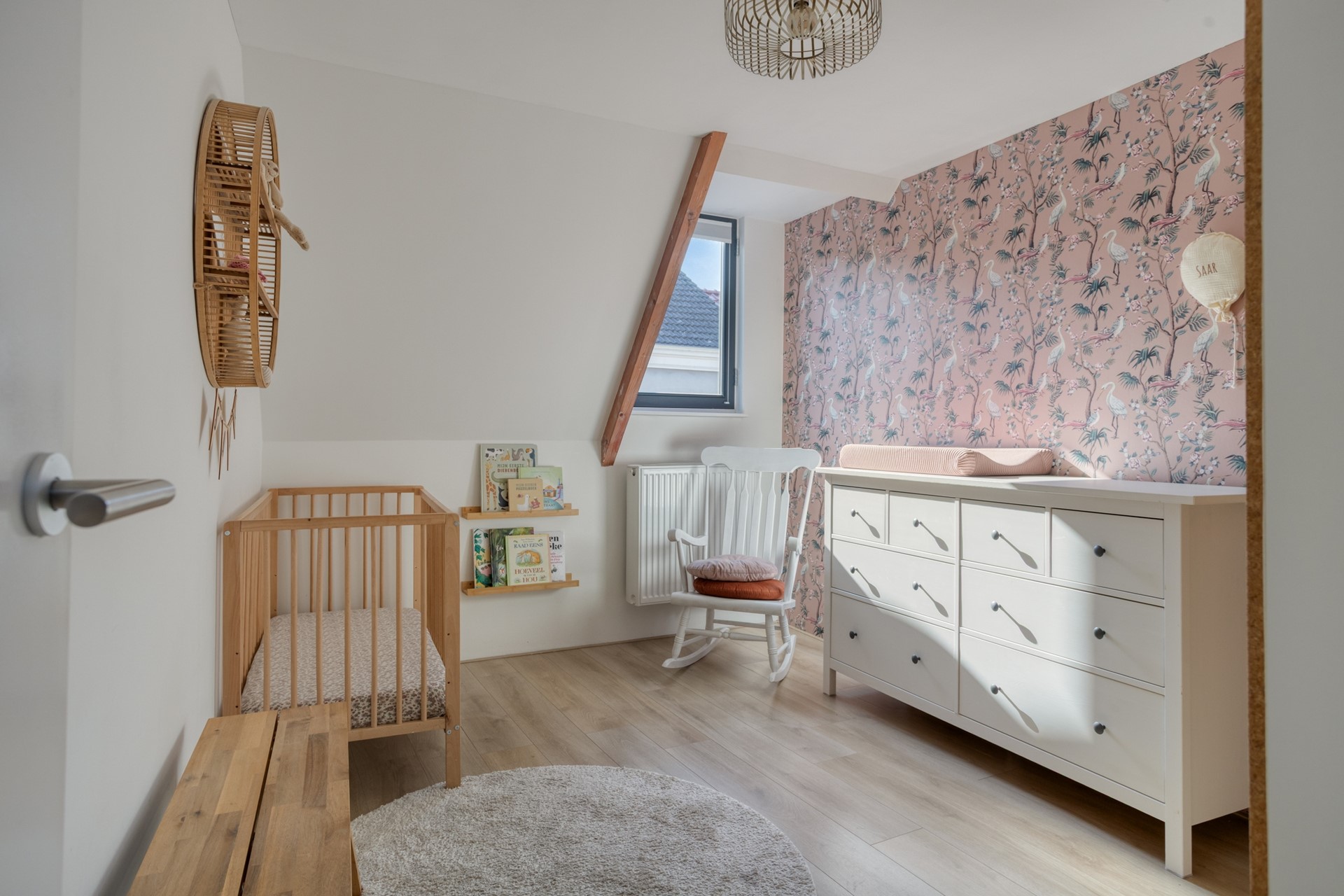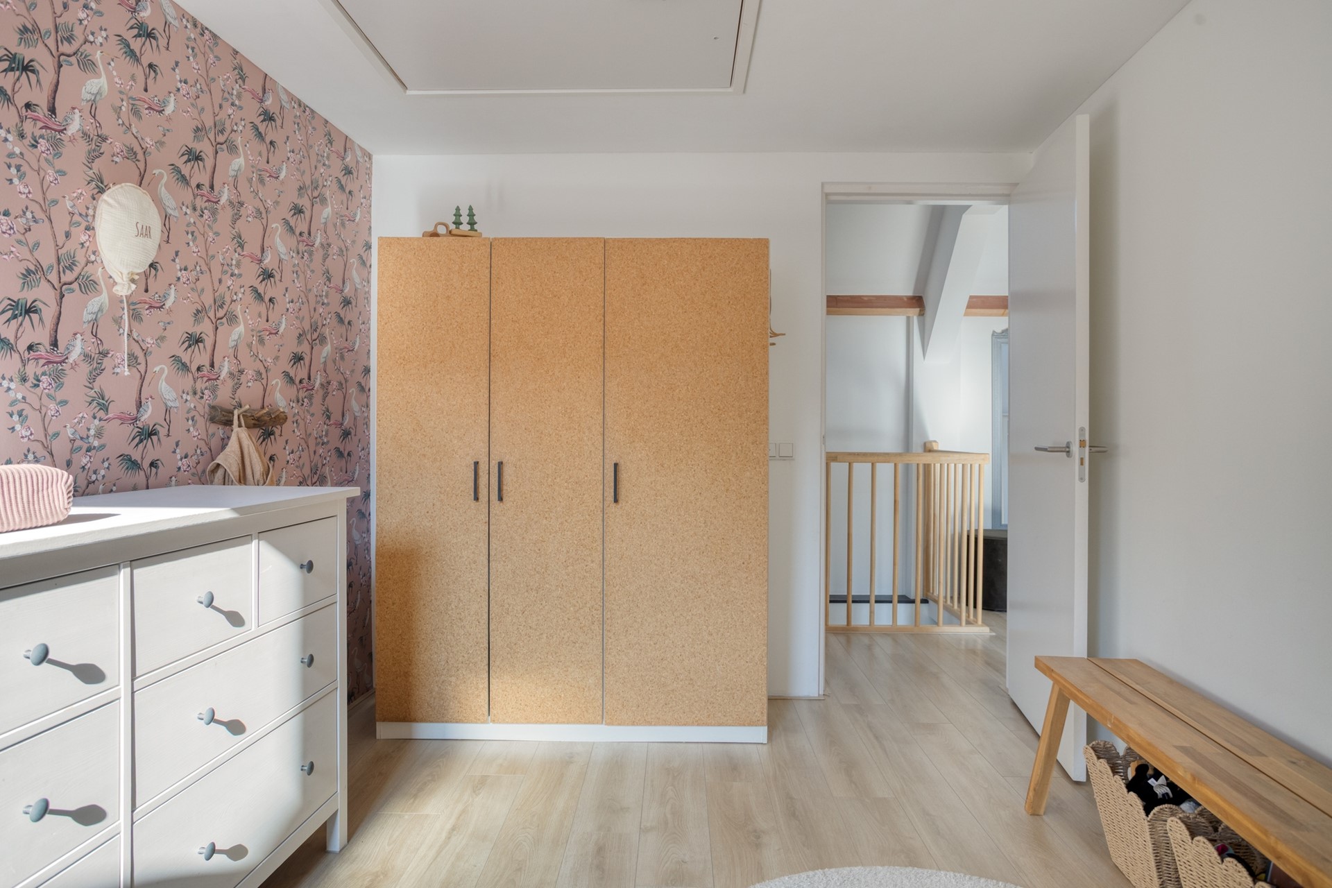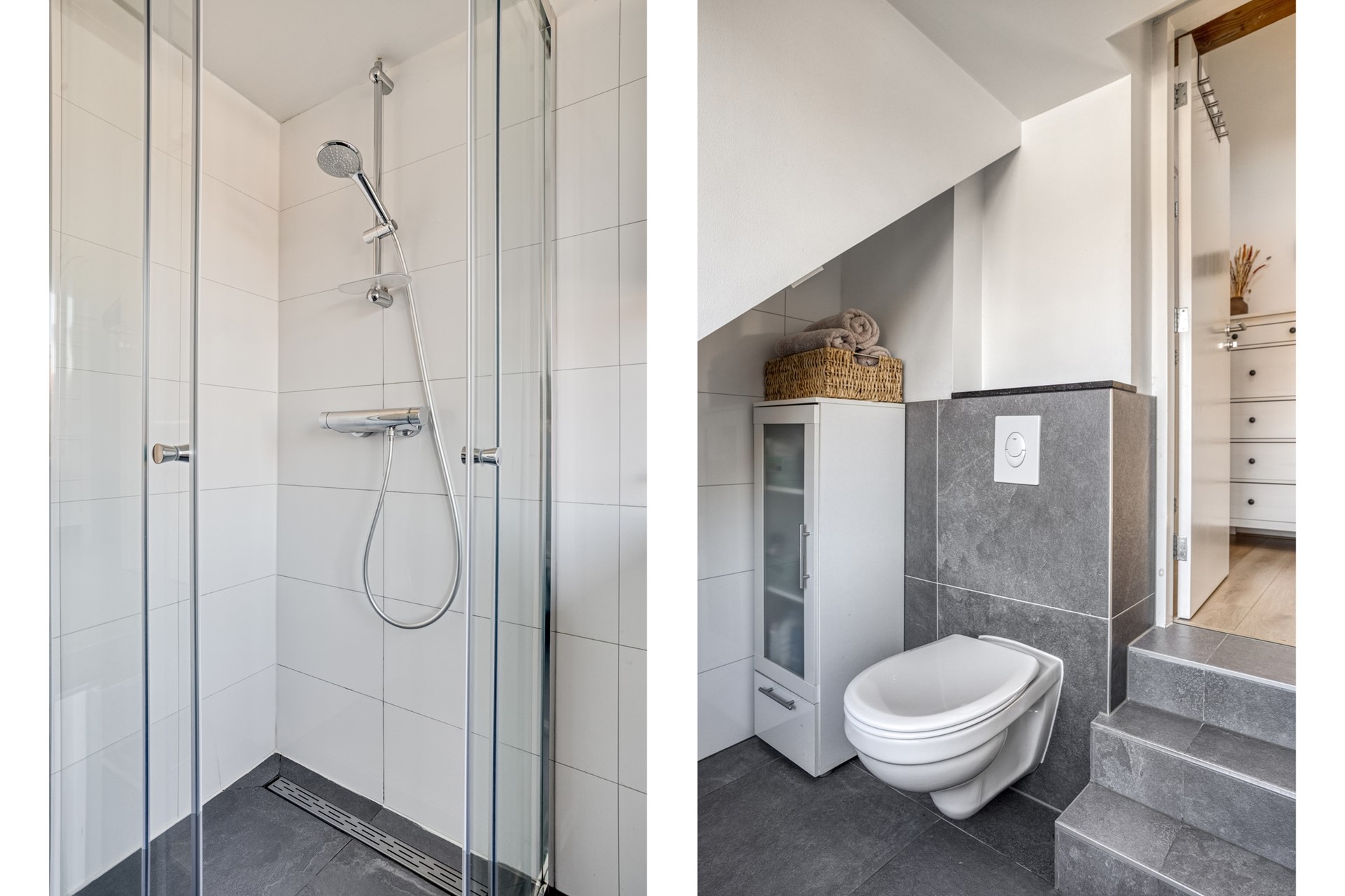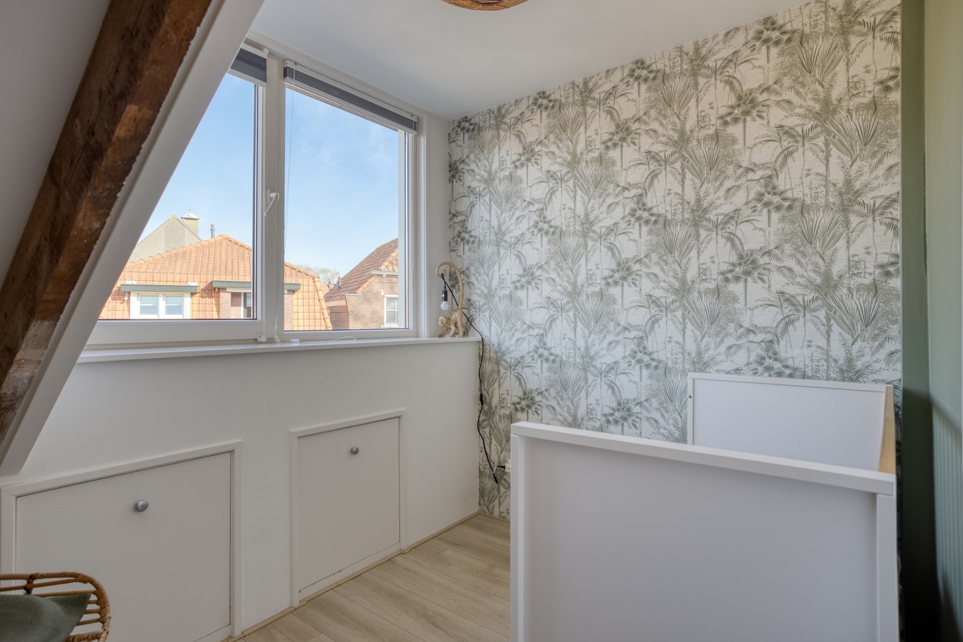 OVERLOOP Ruime overloop met 2 Velux dakramen die zorgen voor veel lichtinval. De overloop geeft toegang tot drie slaapkamers, de badkamer en een extra kast met aansluitingen voor de wasmachine en droger. De verdieping is afgewerkt met een laminaatvloer. SLAAPKAMERS -- Slaapkamer 1, gelegen aan de achterzijde en, is voorzien van een dakkapel en bergruimte achter de knieschotten. -- Slaapkamer 2, gelegen aan de voorzijde, heeft een Velux dakraam. -- Slaapkamer 3, eveneens aan de voorzijde, beschikt over een kleine dakkapel en een luik naar de bergzolder. BADKAMER De lager gelegen badkamer is bereikbaar via drie treden en is gedeeltelijk betegeld. De ruimte is ingericht met een wandcloset, inloopdouche, wastafelmeubel, spiegelkast, radiator en een dakkapel die zorgt voor natuurlijke lichtinval en ventilatie.