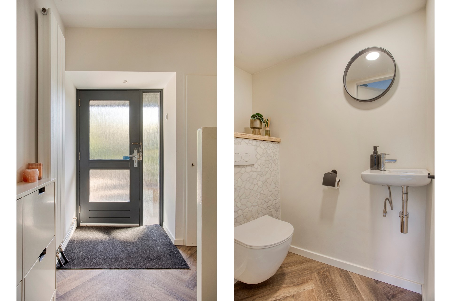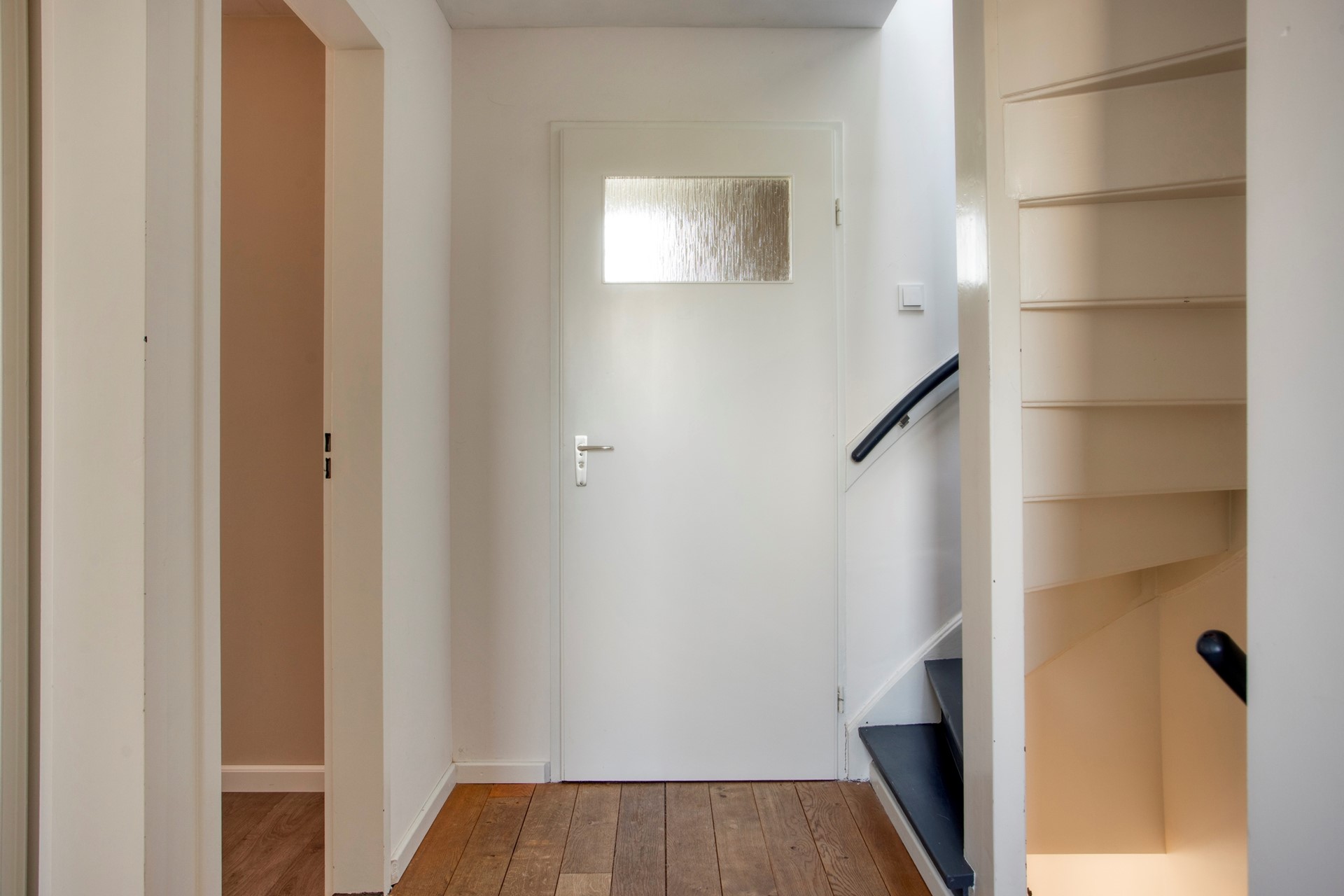 Overdekte entree. HAL Hal met meterkast (7 groepen; kookgroep met aardlekschakelaars), toiletruimte (wandcloset en waterfontein), vaste trap naar de eerste verdieping, een trapkast en toegang tot de woonkamer. Hal en toilet zijn voorzien van een PVC vloer en designradiator. WOONKAMER Woonkamer met semi-openkeuken zijn voorzien van een PVC vloer en vloerverwarming en een airco unit. De lichte woonkamer is van het type doorzonkamer met aan de voor- en achterzijde grote raampartijen. Aan de achterzijde vind je ook een loopdeur welke toegang geeft tot de achtertuin. KEUKEN De semi-openkeuken met een L-vormig aanrechtblad met betegelde achterwand, een rvs spoelbak met mengkraag, 6 pits gasfornuis met oven (Solitaire); vaatwasmachine; koelkast en diverse onder- en bovenkastjes. Via een deur kom je in de bijkeuken. BIJKEUKEN In deze praktische ruime bijkeuken (3,36 x 2,34m) heb je veel opslagmogelijkheid en zijn de aansluitpunten voor de wasmachine en wasdroger. Via een deur in de bijkeuken kom je in de achtertuin.