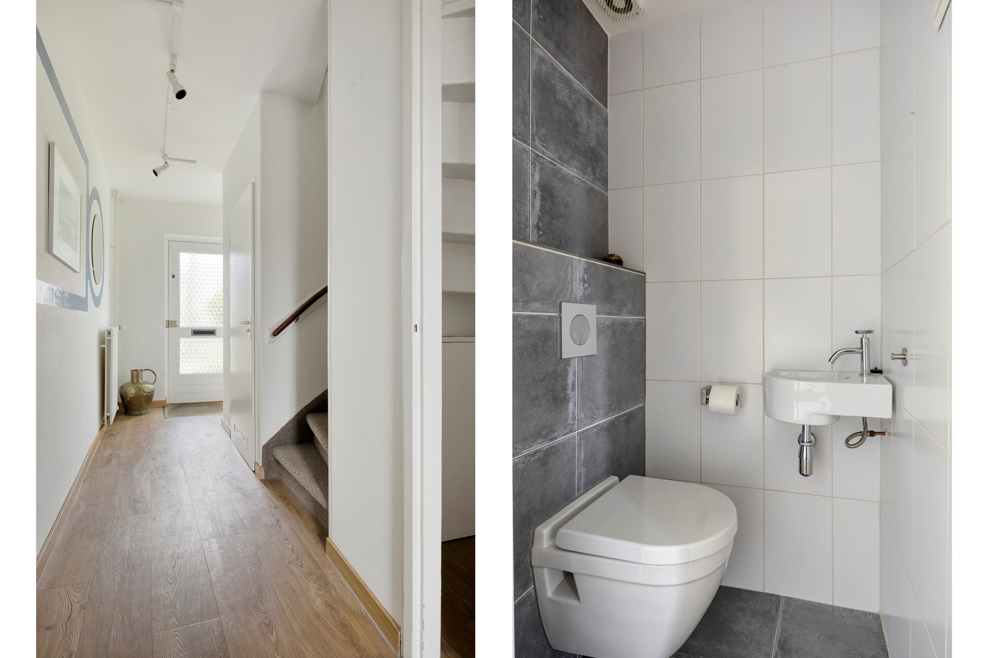Overdekte entree. HAL De hal is voorzien van een PVC vloer, een meterkast met opstelling van waterontharder, garderobegelegenheid, trapopgang naar de eerste verdieping. De hal biedt verder toegang tot de toiletruimte, woonkamer en keuken. TOILET Geheel betegelde toiletruimte met wandcloset, fonteintje en mechanische ventilatie. WOONKAMER Doorzon woonkamer, afgewerkt met een PVC vloer, stucwerkwanden en -plafond, een erker aan de voorzijde en aan de achterzijde een loopdeur naar de tuin. KEUKEN De keuken met tegelvloer, heeft aan weerszijde een moderne lichte keukeninrichting in rechte opstelling met natuurstenen aanrechtblad en -achterwand, een inductie kookplaat met 5 zones, afzuigkap, koelkast, vaatwasser, oven, rvs spoelbak met kokend water kraan en diverse onder-, bovenkasten en lades. Via een glazen pui met loopdeur biedt de keuken toegang tot de achtertuin.