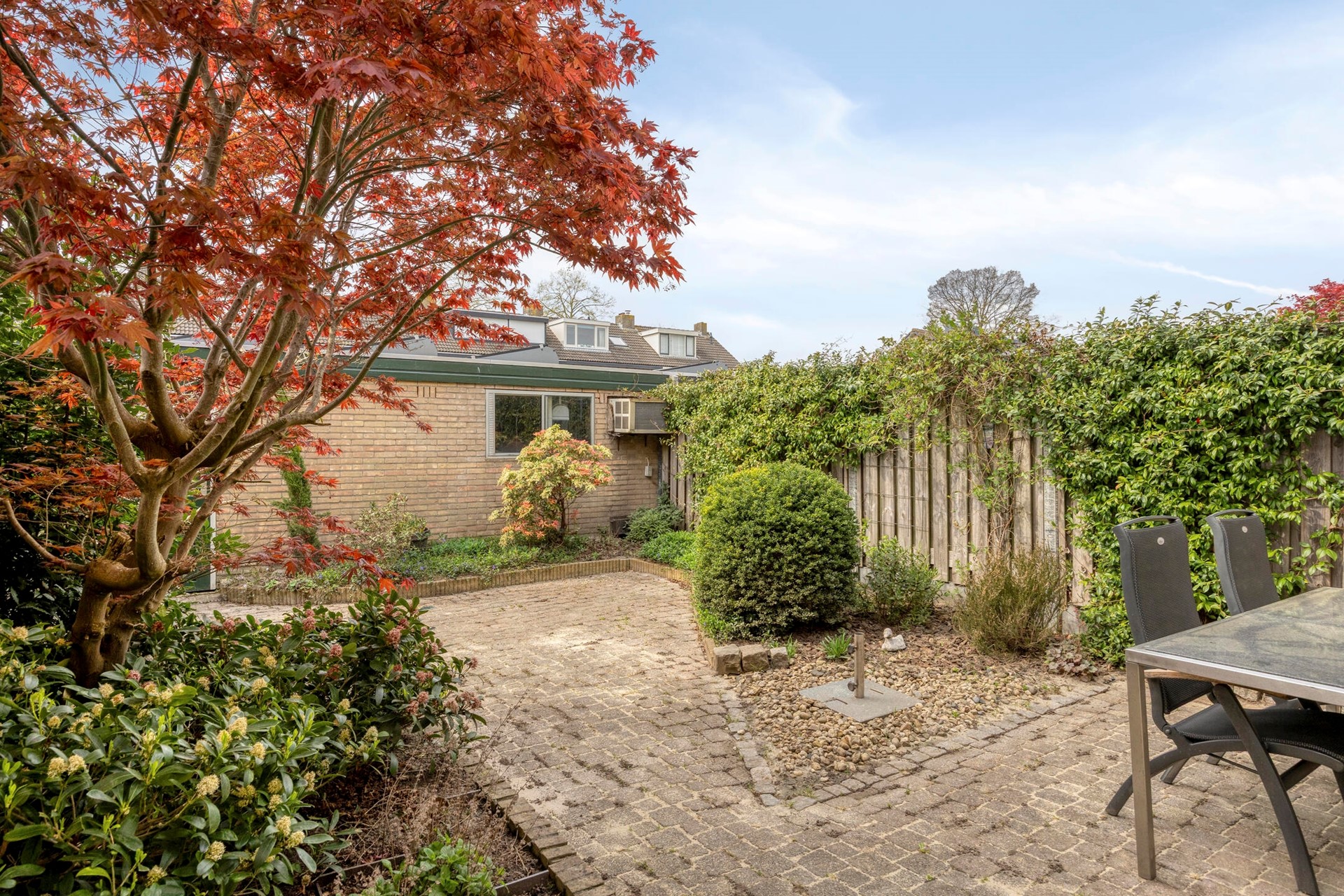 VOORTUIN Goed onderhouden voortuin van ca. 5 x 6 m. ACHTERTUIN De privacy biedende achtertuin (circa 8,5 x 6 m.) is georiënteerd op het westen, grotendeels bestraat en voorzien van diverse borders met meerjarige beplanting, een buitenkraan en verlichting. Aan de achtergevel van de woning bevindt zich over de gehele breedte een zonnescherm. Achterin de tuin staat de ruime garage/berging voorzien van elektra. De garage/berging bestaat uit twee compartimenten en heeft een loopdeur naar de tuin en een garage- en loopdeur naar de achtergelegen garageboxen. Op het dak van de garage zijn 9 zonnepanelen geplaatst.